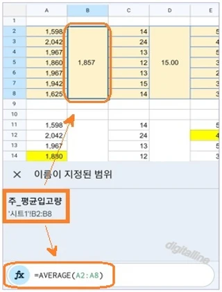 - "주_평균입고량"을 누르면 해당 셀이 선택되고 하단에서 수식을 확인합니다. 스프레드시트에서 데이터 추적이 용이합니다.