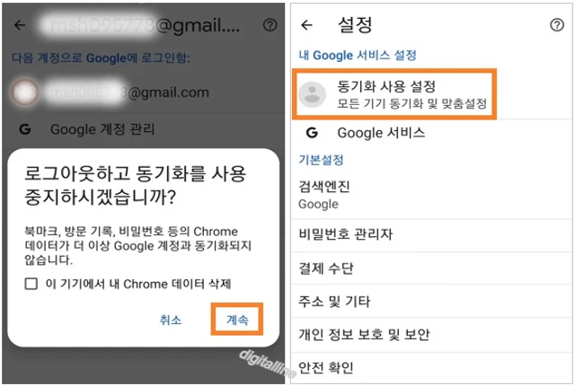 ⓢ '로그아웃하고 동기화를 사용 중지하시겠습니까?' 팝업 창에서 계속을 탭합니다.