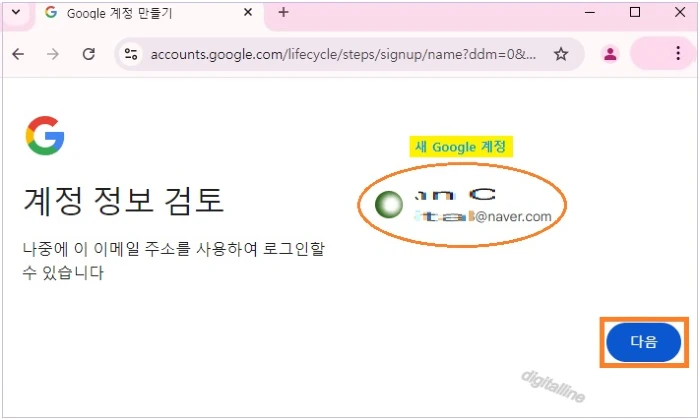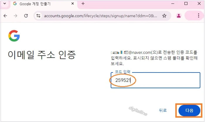 ⑧ 이메일로 전송된 코드를 입력하여 '새 Google 계정'에 사용하려는 이메일 주소를 인증하고, 다음을 클릭합니다.