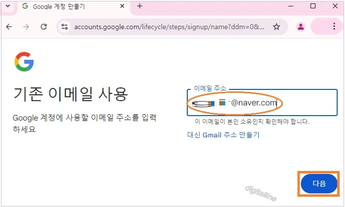 ⑥ 기존 이메일 주소를 입력합니다. Gmail이 아닌 다른 이메일 주소를 사용합니다. 다음은 네이버 이메일 주소를 사용해서 '새 Google 계정' 만드는 예시입니다.