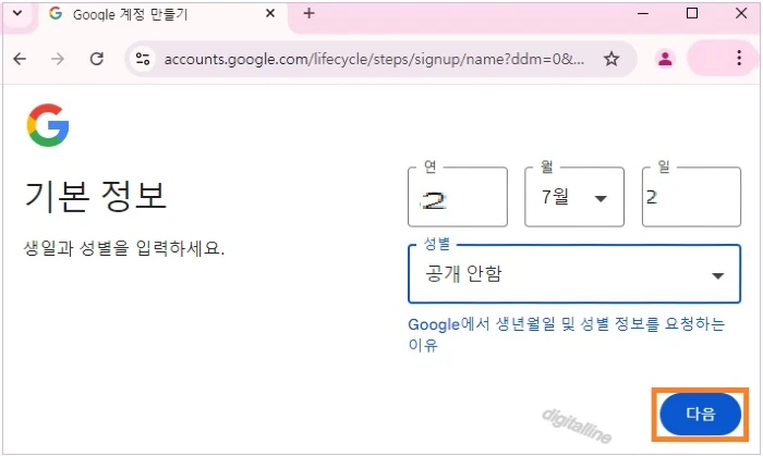 ④ '기본 정보'에서 생년월일, 성별을 입력하고, 다음을 클릭합니다.