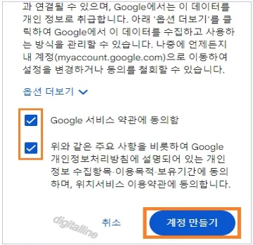 ⑪ 개인 정보 보호 및 약관을 읽고 하단에서 약관 및 개인 정보 수집에 동의 후 계정 만들기를 클릭합니다.